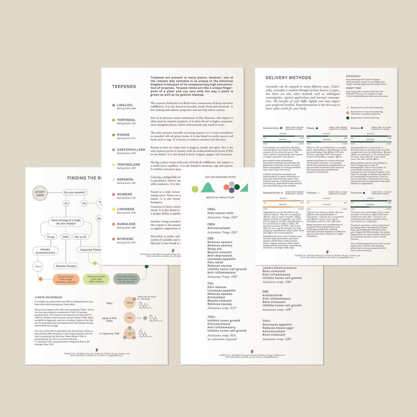The Medical Cannabis Info Cards are a series of infographics designed to help patients develop a deeper understanding of cannabis' therapeutic effects. Styled in our renowned visually appealing format, each card presents detailed information on concepts related to medical cannabis use. Some of the topics covered include: common terms, dosing, the potency and duration of various delivery methods, phytocannabinoids, terpenes, the endocannabinoid system, and more. These cards serve as an excellent companion when paired with our Patient Journal and CBD Jotter. The Medical Cannabis Info Cards were created in collaboration with Haiikuu Design and are printed on a durable and coated stock and packed into a gorgeous envelope.