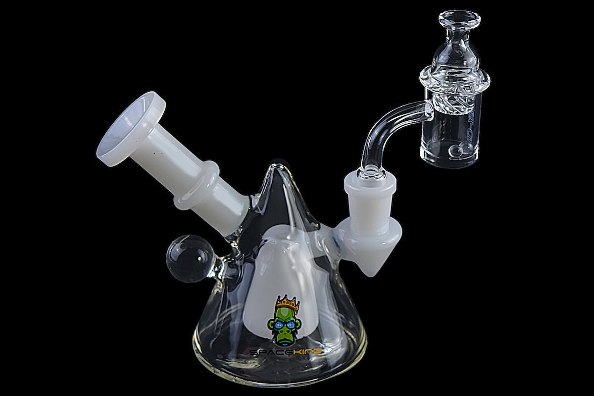 The Space King Glass 'Space Pyramid' Mini Rig is a unique pyramid shape rig with a cone head percolator, for a smooth hit, every hit. Kit comes with a banger bowl and carb cap, inside a beautiful display box. This special setup is designed with your comfort and satisfaction in mind. Smoothly draw in those clouds and get ready for an out-of-this-world smoking experience. Thanks to Space King glass, your sesh will be sent into orbit!