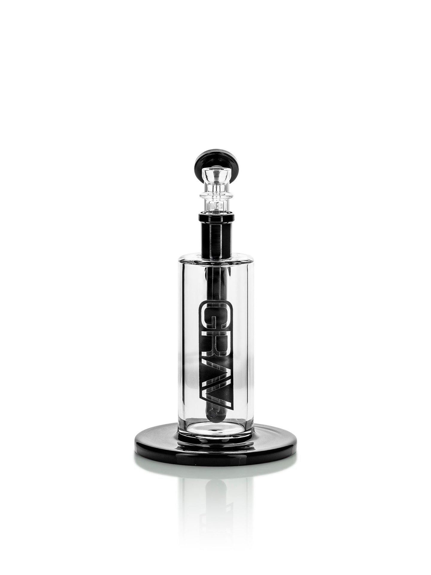 The GRAV Medium Upright Black Accents Bubbler is 7" tall and made on 44mm tubing with black accents. Its fission downstem diffuses smoke through water and is fixed inside the bubbler to prevent damage. Its angled mouthpiece acts as a splashguard, and its lip wrap is tooled for comfort. The upright bubbler comes ready to use with a 14mm cup bowl and works best with approximately 2" of water.