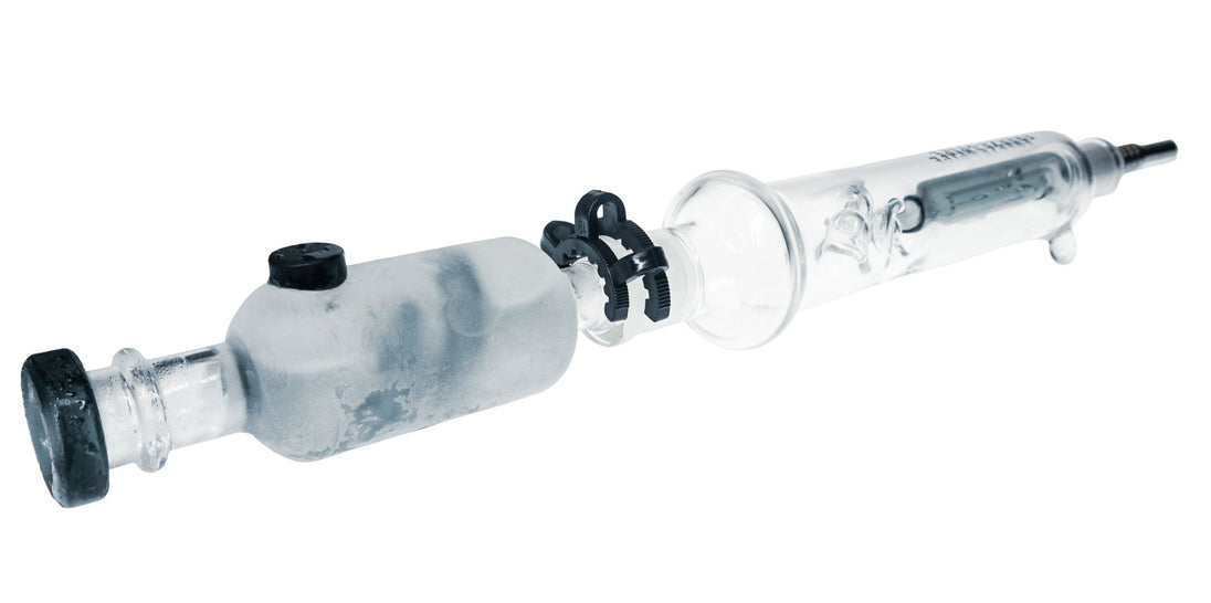 The Freeze Pipe Nectar Collector combines freezable glycerin-coil-coldness with just the right amount of water filtration to create one of the smoothest dab rigs available. It's the only nectar collector that has a glycerin coil, and the built-in bubbler function brings a level of water filtration rarely matched by its dab rig counterparts. Smoother, tastier and bigger dabs have never been easier as this piece sets up in seconds and includes a gift box for portability. A tad larger and heavier than the norm, this unique Nectar Collector exudes craftsmanship and boasts ultra-thick glass fitted with stability legs.