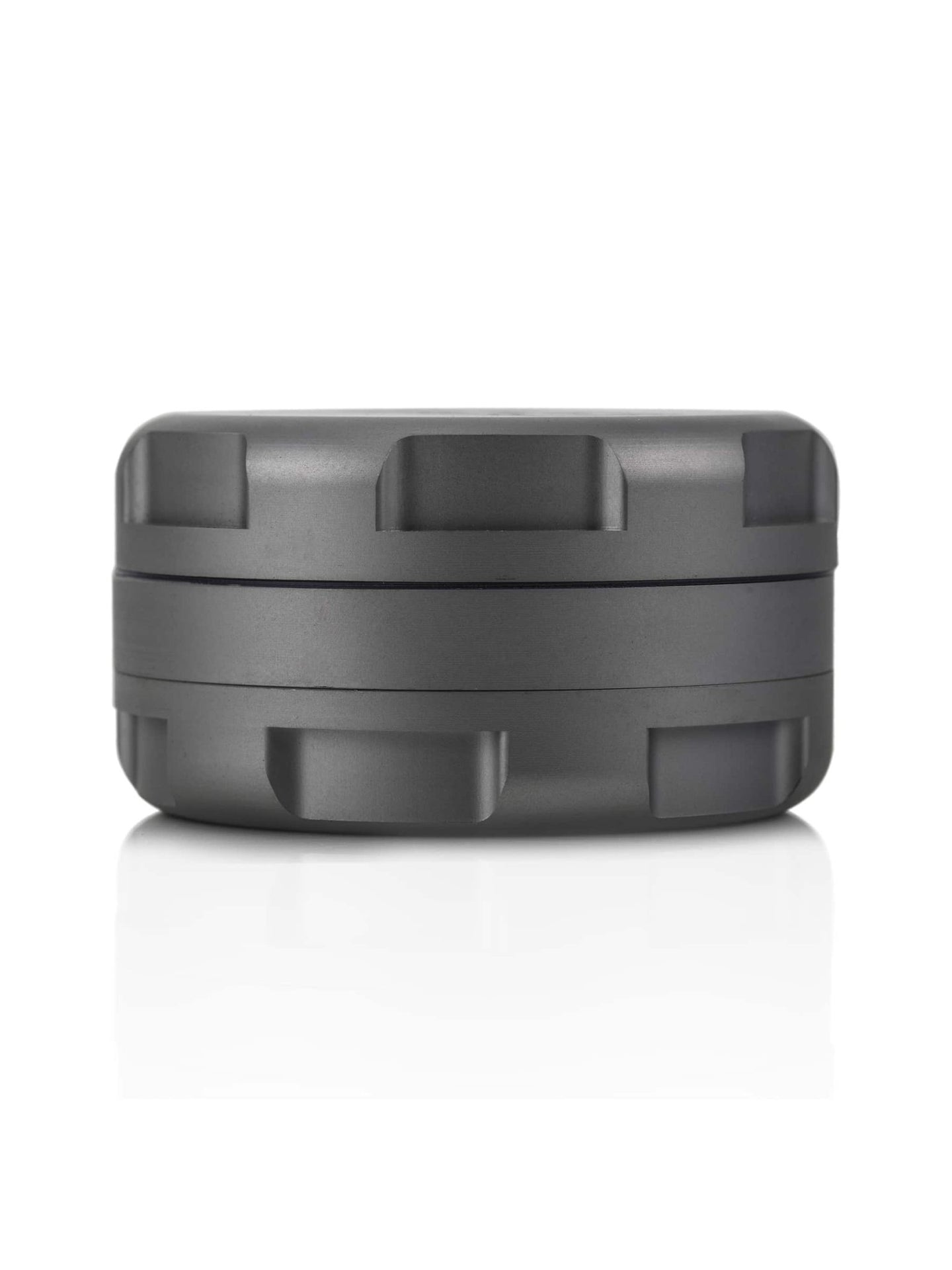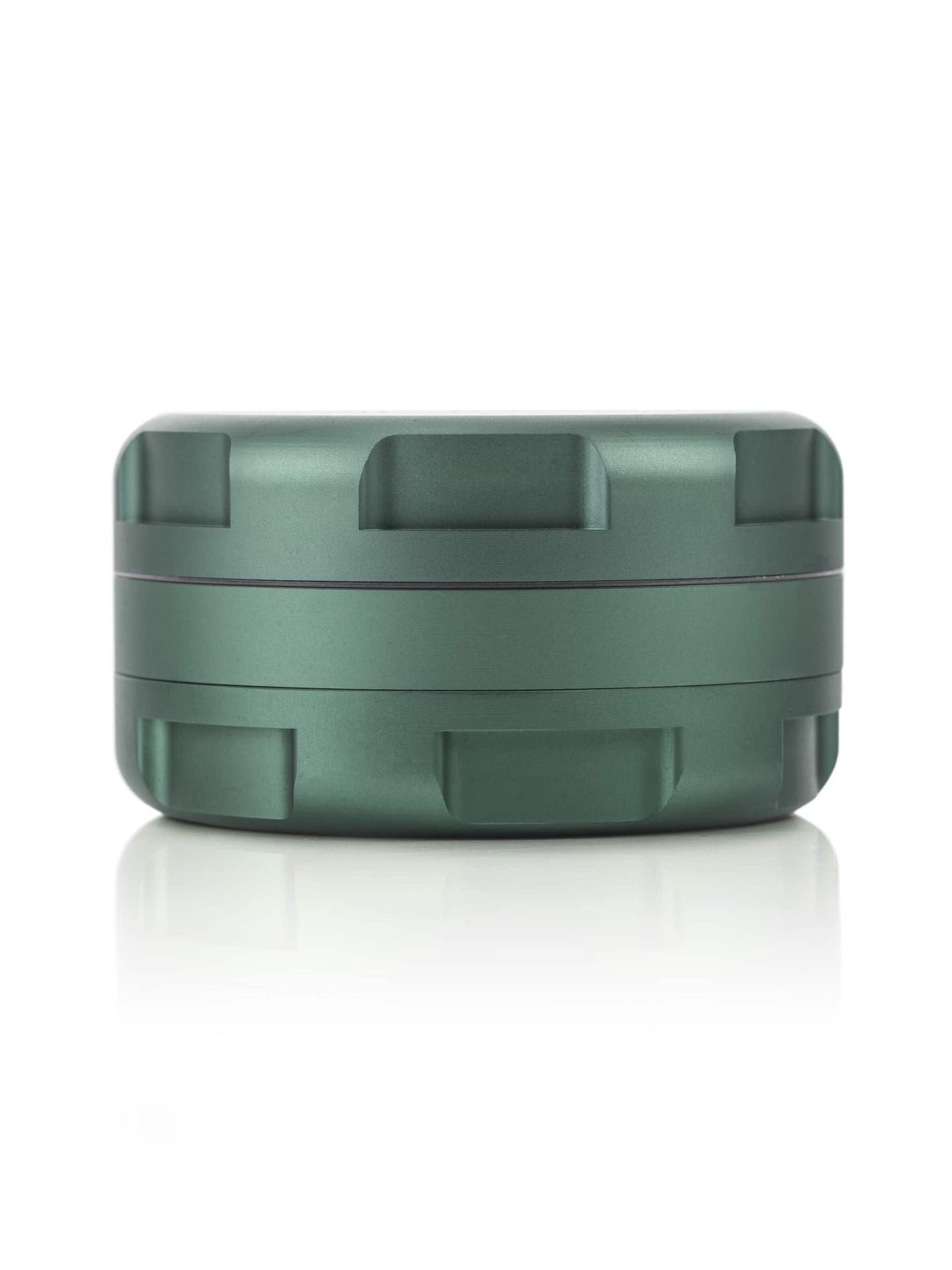 The GRAV® 3-Piece Grinder is 1.25" tall and made on CNC aluminum. The 15 teeth and holes in its upper chamber are well-spaced to prevent clogging. Its bottom chamber features a GRAV® branded aluminum scraping tool. The edge of the tool is curved to perfectly fit the interior curve of the grinder.