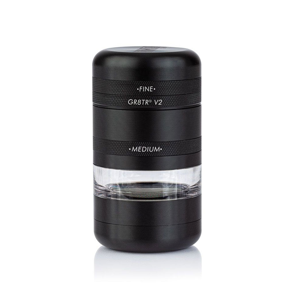 Made from durable food-grade materials, the GR8TR V2 Series Grinders w/ Jar Screen Chamber are also available in matte silver, matte blue and rose gold.