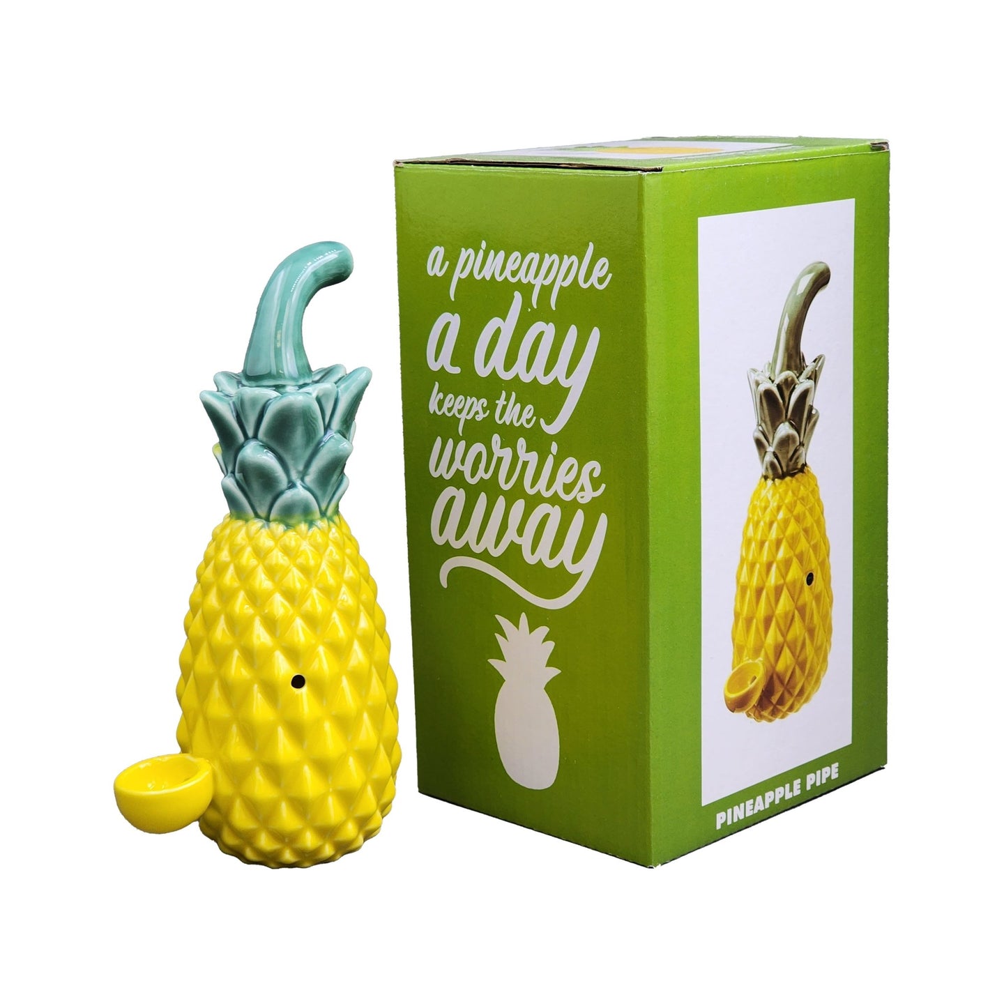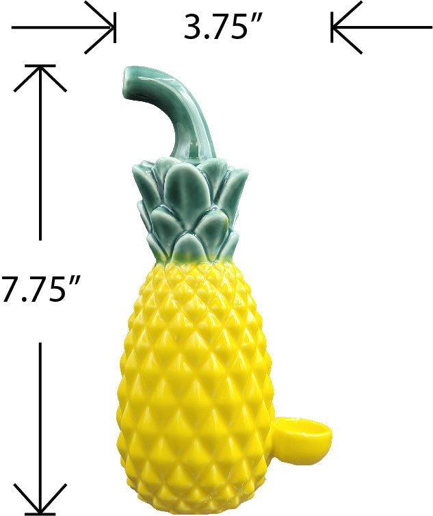 The Ceramic Pineapple Hand Pipe has a geometric texture exterior and is reminiscent of a trinket found on your grandmother's China hutch. Made with ceramic and stands 8 inches (20.32 cm) tall. Each pipe is individually packaged.