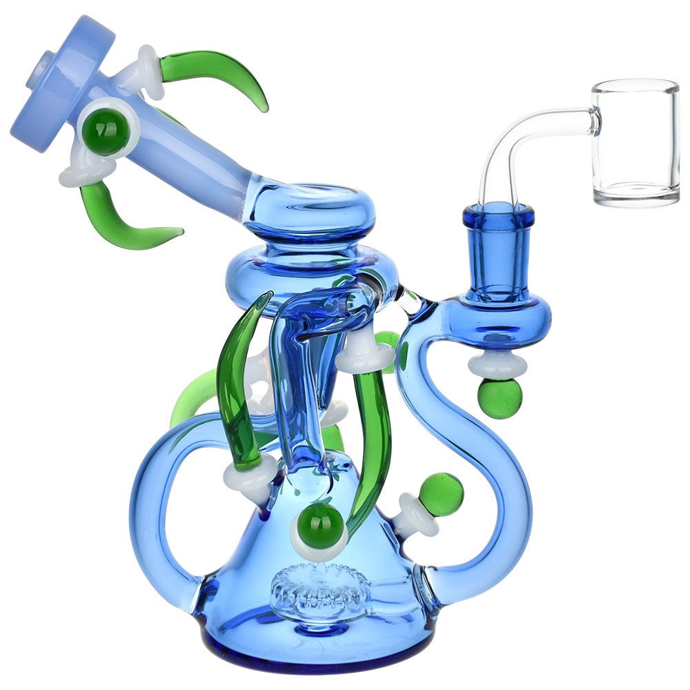 The Claw's Caress Recycler Rig boasts a height of 7 inches and features a unique Recycler style design with a Circ percolator. The decorative claws and marbles add a touch of personality to the rig, all constructed from durable borosilicate glass. Additionally, the rig comes with a 14mm male quartz banger for added convenience.
