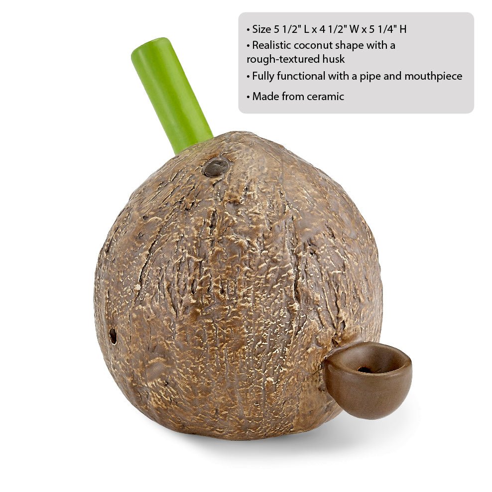 This fun stoner adult pipe is made of ceramic. It is designed in the shape of a coconut with a rough-textured husk in tones of brown and cream.