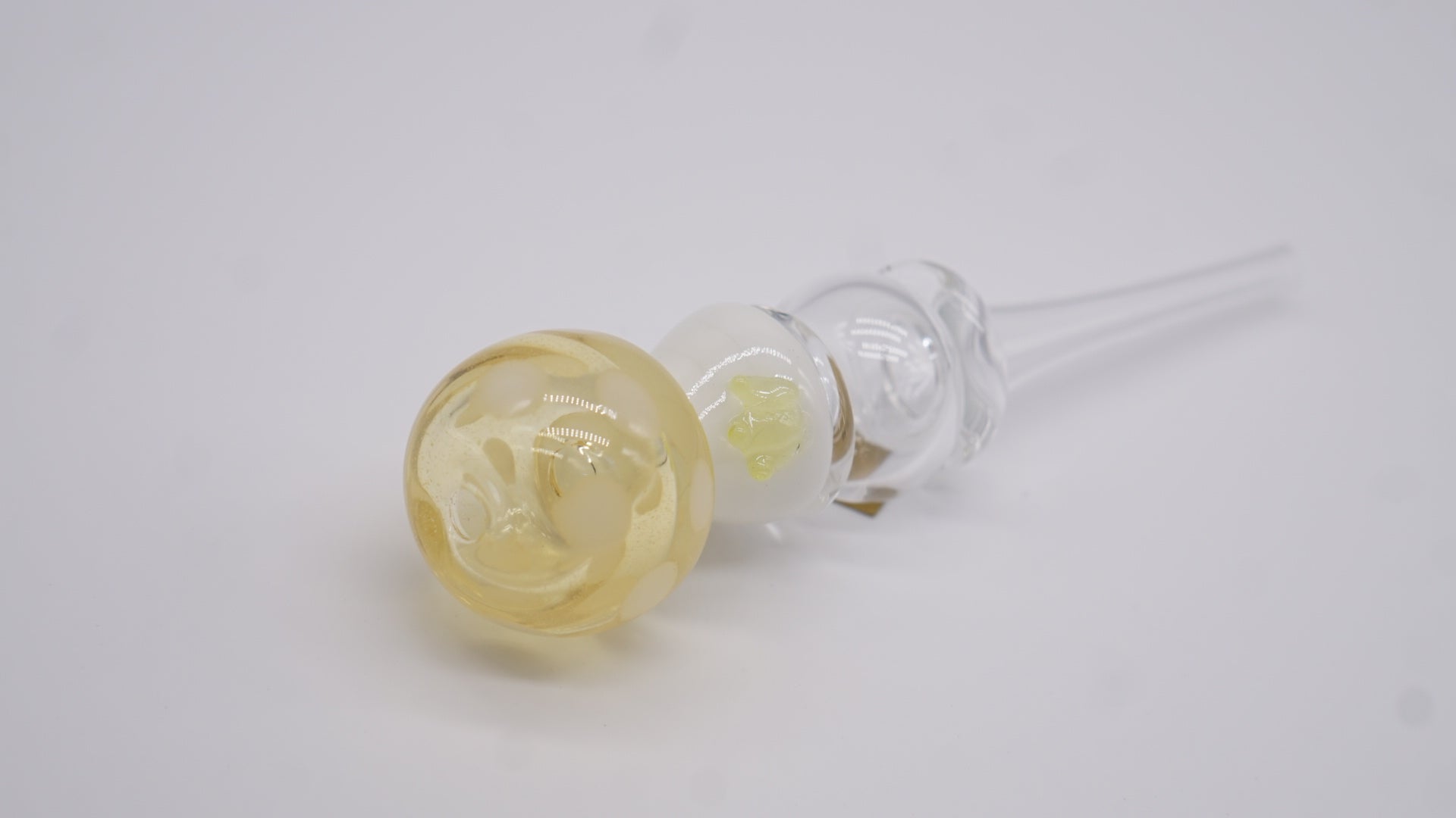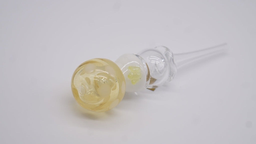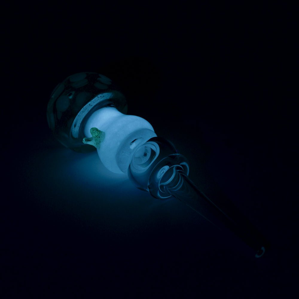 Empire Glassworkโs honey straws are a testament to their lamp work mastery. Equipped with their signature honey straw design, this piece features a color changing glass called CFL Serum.ย This color naturally changes in different spectrums of lighting, creating a unique experience wherever you are.ย ย The stem of the mushroom body is accented with glow in the dark glass, bringing the mushroom to life for nocturnal tokers.