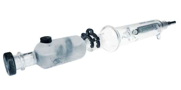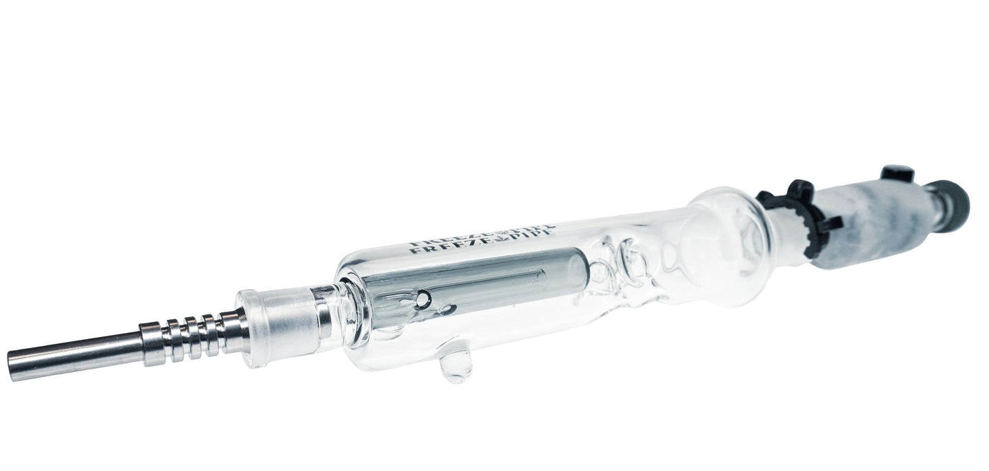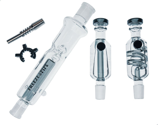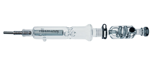 The Freeze Pipe Nectar Collector Kit combines freezable glycerin-coil-coldness with just the right amount of water filtration to create one of the smoothest dab rigs available. It's the only nectar collector that has a glycerin coil, and the built-in bubbler function brings a level of water filtration rarely matched by its dab rig counterparts. Smoother, tastier and bigger dabs have never been easier as this piece sets up in seconds and includes a gift box for portability. A tad larger and heavier than the norm, this unique Nectar Collector exudes craftsmanship and boasts ultra-thick glass fitted with stability legs. The Kit version includes a second glycerin chamber with a straight-through style coil for less cooling, but better airflow as well as a Koozie to keep them colder for longer.