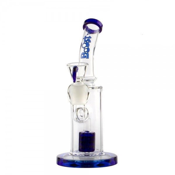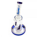 The glass water pipe has a flared based and an angled mouthpiece. The style is capped off by blue accents on the base, mouthpiece, bowl, percolator, and logo.Â