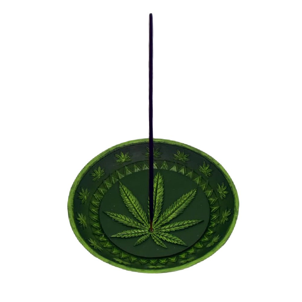 This Hemp Leaf Dish Incense Burner has an all green color and a hemp leaf design. Measuring 5 inches (12.7 cm) wide, this incense burner can hold either incense sticks or cones.