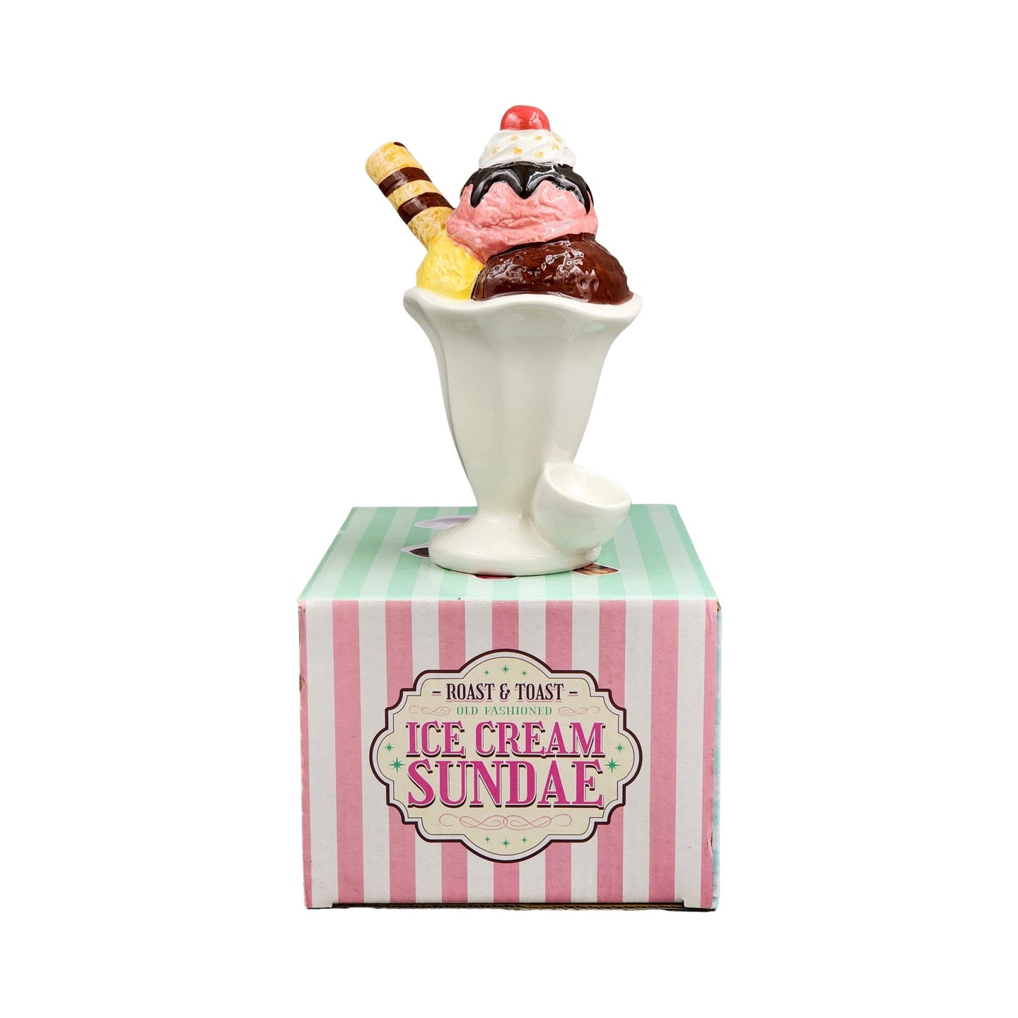 This fun old-fashioned ice cream Sundae themed novelty pipe is made of ceramic. It is designed in the shape of a parfait glass filled with delicious scoops of chocolate, strawberry and vanilla ice cream, topped with a chocolate wafer stick, cream and a cherry!