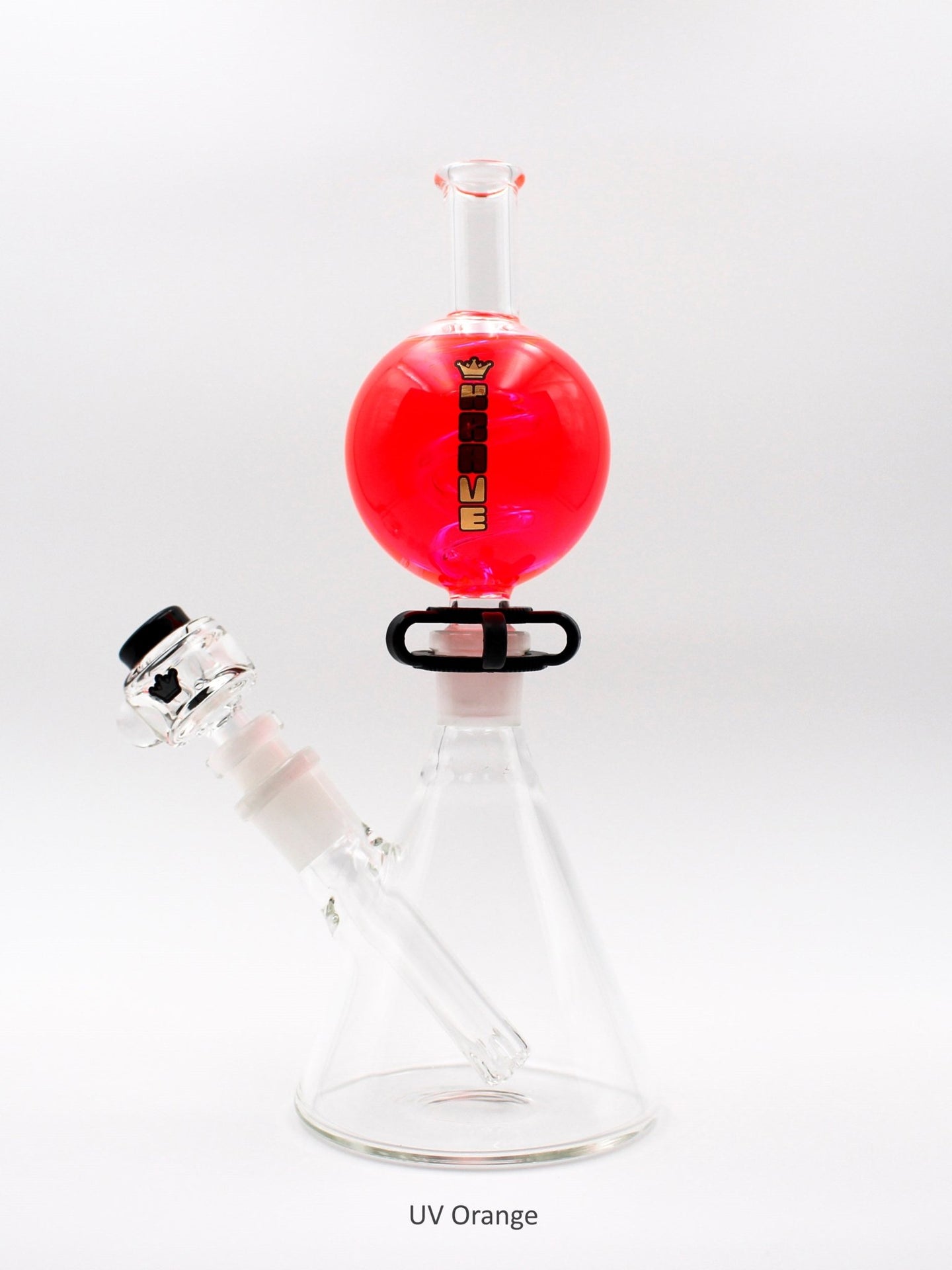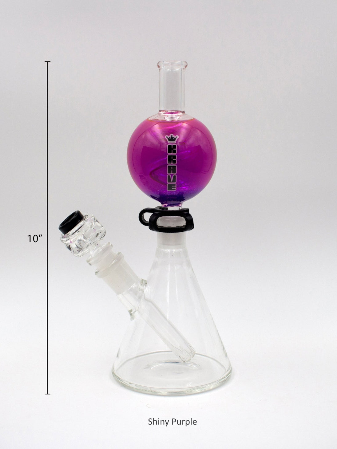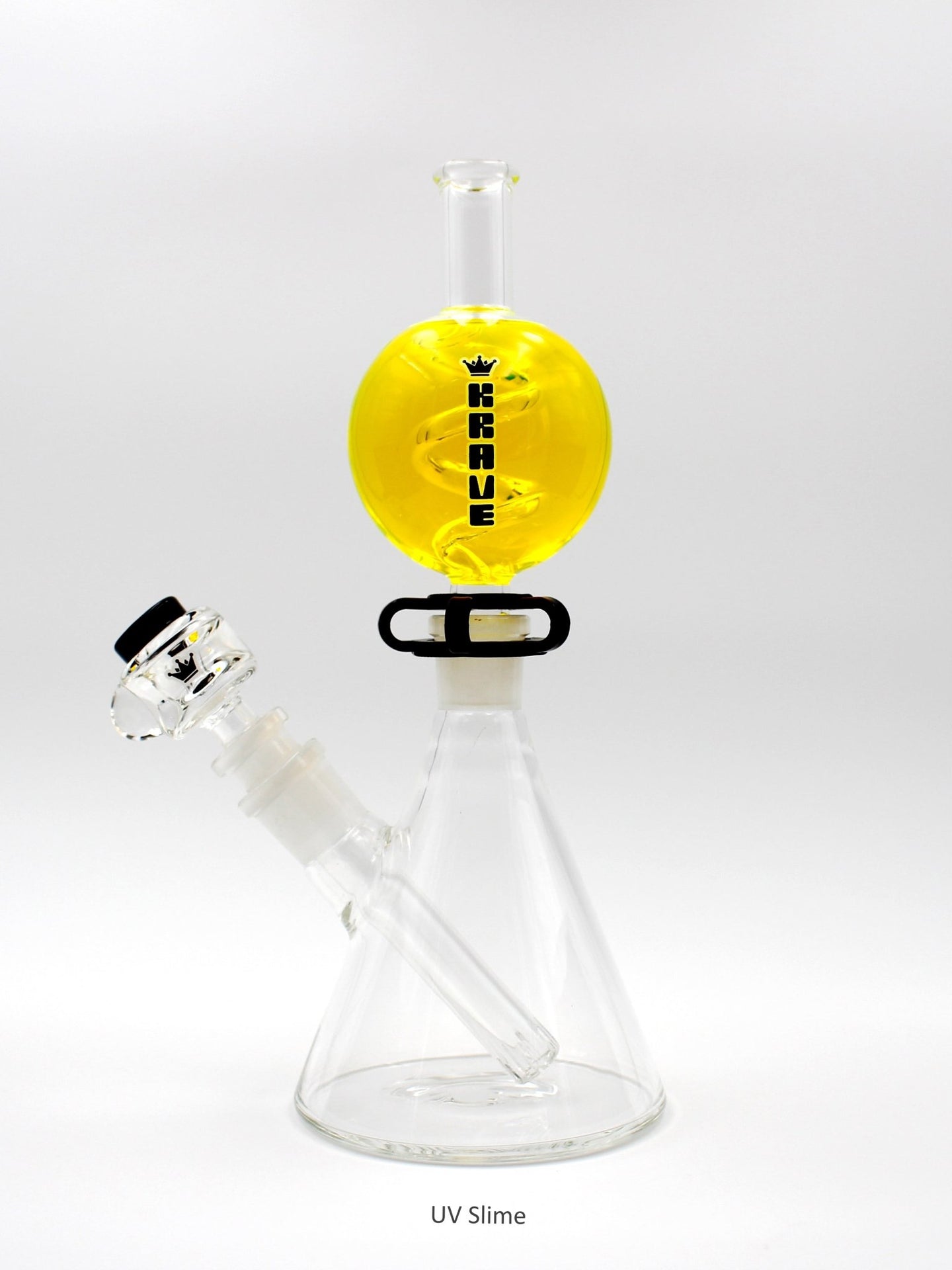 This Krave Glass Beaker Orb comes with a 4" Diffusing Downstem and a Krave-branded dry herb bowl. The downstem is a slim-looking, almost flush-fit downstem which can accept 14mm attachments, such as the included bowl! If you have other 14mm accessories for your pipes, slip them in for added awesomeness.