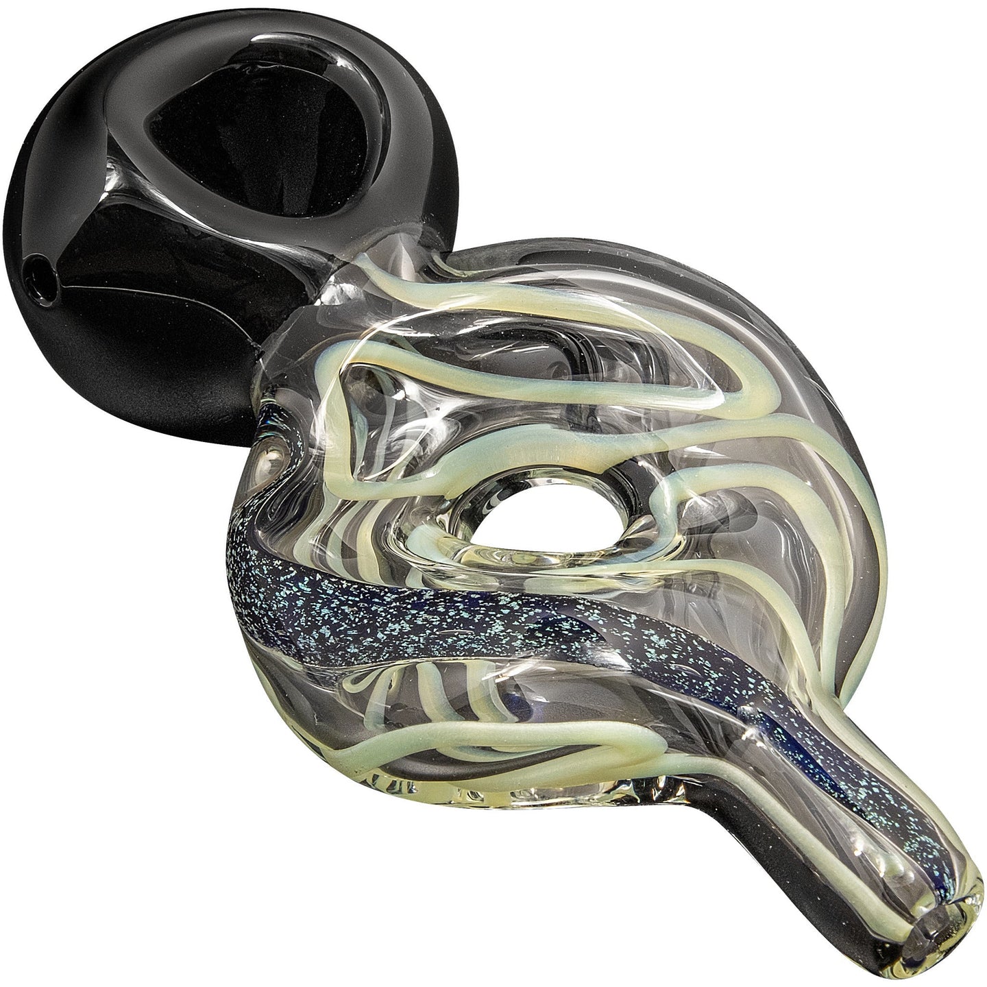 Introducing a kickass pipe designed to help you get your mind in the right space. This one-of-a-kind LA Pipes Dichro Donut Slime Pipe features vibrant dichroic and slime colors, with a sleek black head and a distinctive body that guides the smoke through two chambers before it reaches your mouth.