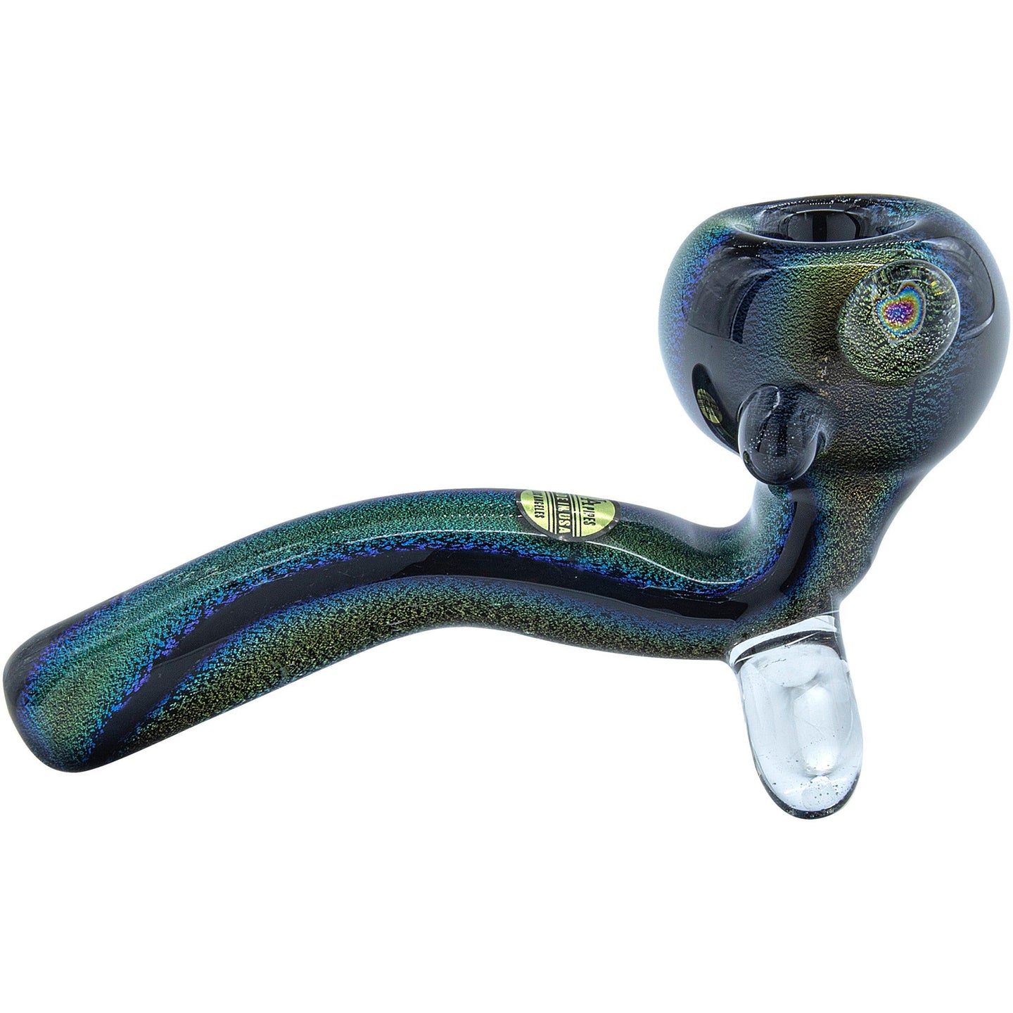 Introducing the captivating LA Pipes "Supernova" Sherlock Pipe! This exceptional piece is meticulously handcrafted using high-quality dichroic glass borosilicate tubing, guaranteeing an unparalleled dichro experience. Its striking design showcases a beautifully contoured body, complete with a transparent magnifier marble on the front and clear marble feet to ensure perfect stability on any surface.