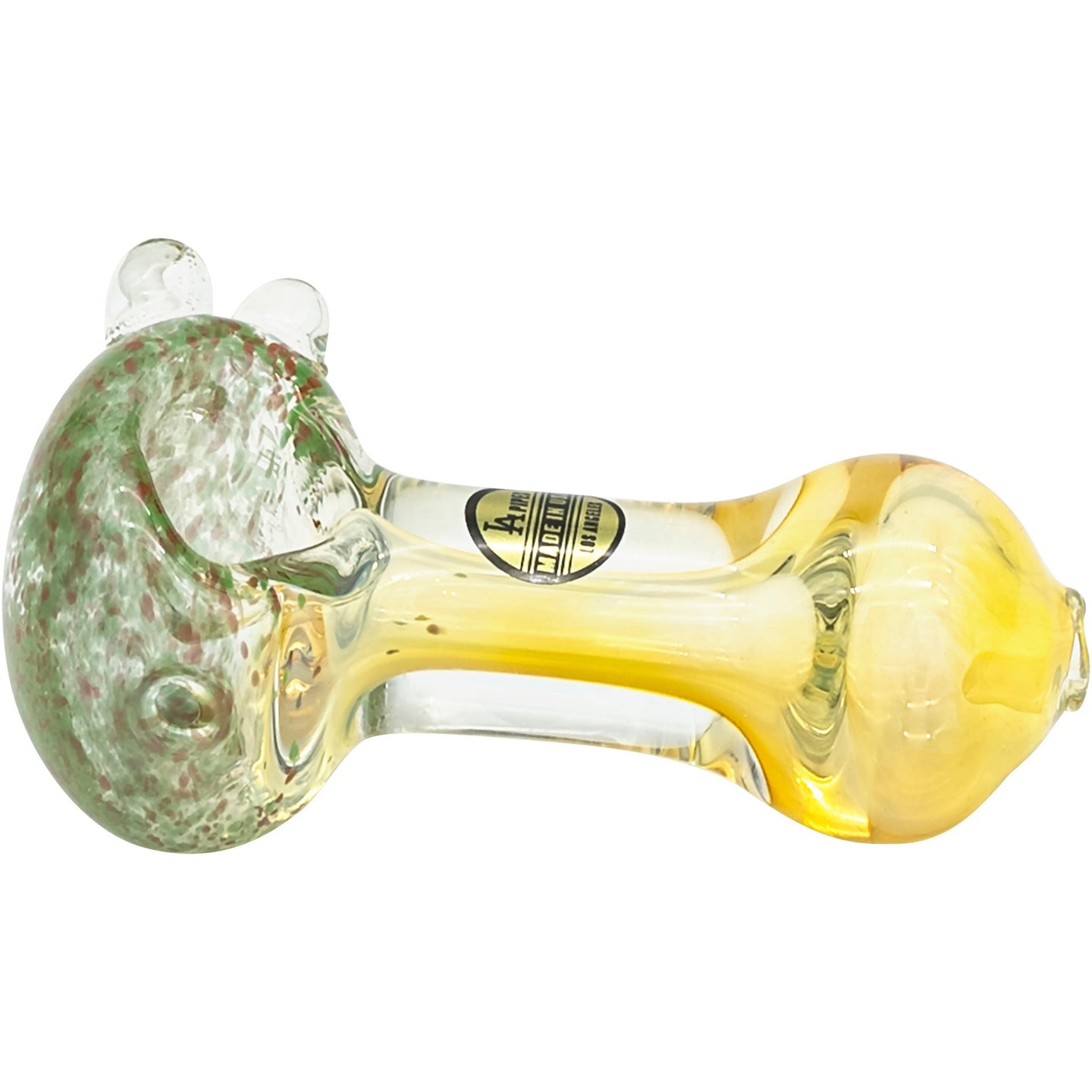 Introducing the incredible LA Pipes "Thick Neck Freckles" Pipe! This remarkable creation showcases a neck as bulky as it gets, adorned with charming speckles on its head. Get ready to be astonished by its silver-fumed exterior, which undergoes a color transformation right before your eyes. The inside-out frit freckle design adds an extra element of brilliance to this exceptional glass hand-pipe. And let's not forget about the generously-sized bowl, convenient carb, and flared mouthpiece that contribute to making it an absolute pleasure to use.