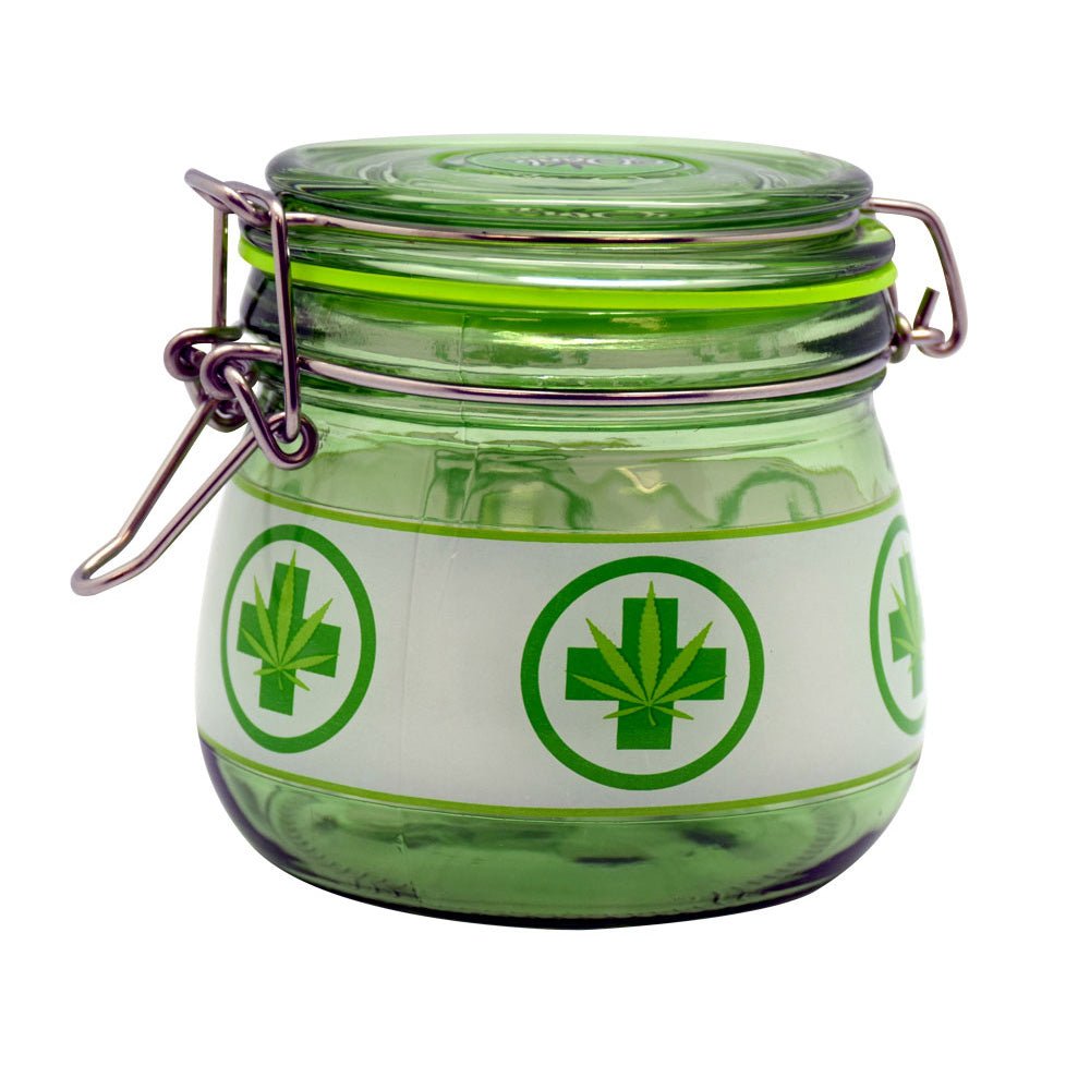 The Medical Leaf Glass Jar is great for stashing your favorite herbs. Features a medical hemp leaf design and hinged latching lid. Measures approx. 4" tall and 4.3" wide. Holds approx. 1 ounce.