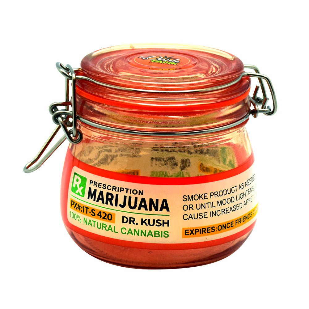 This Prescription Glass Storage Jar is great for stashing your favorite herbs. Features a faux prescription design and hinged latching lid. Measures approx. 4" tall and 4.3" wide. Holds approx. 1 ounce of dry material.