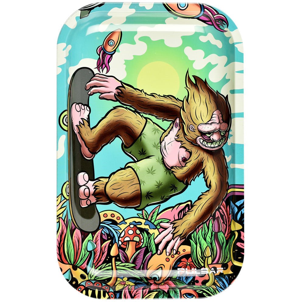 The Pulsar Artist Series Yeti McShreddy Metal Rolling Tray features a cool yeti shredding his way through the atmosphere, by featured artist Voodoo Salad. This tray has rolled edges for strength, safety and containment of your favorite herbaceous product. This artistic colorfast tray will never peel, chip or fade and is easy to clean. Comes in medium (11" x 7") size.