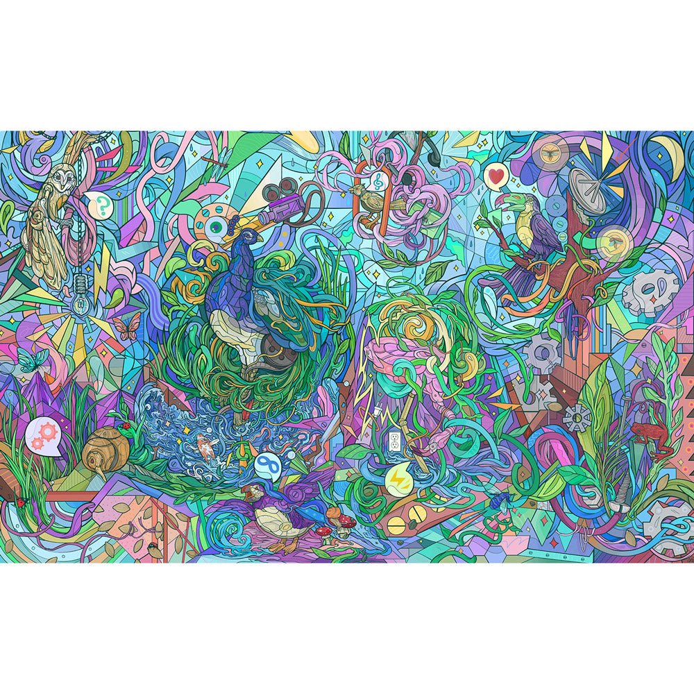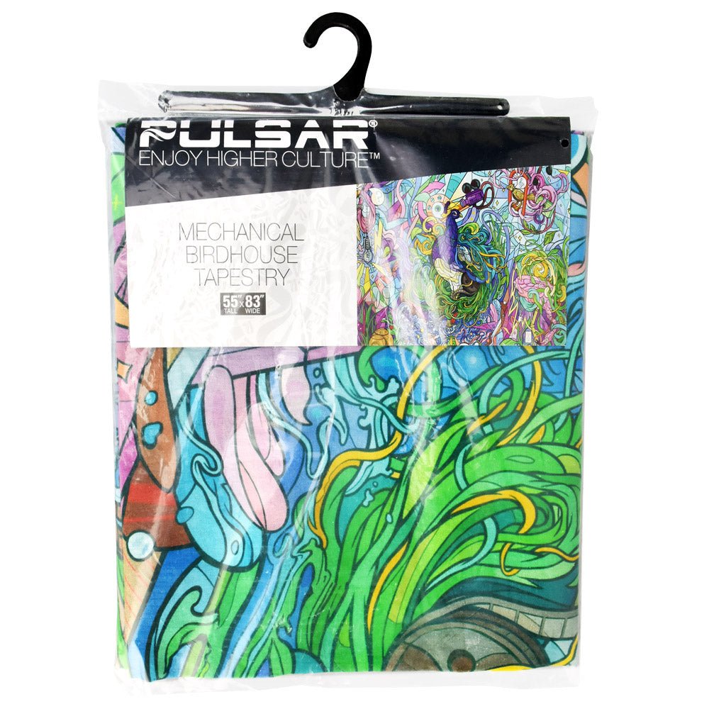 This Pulsar Mechanical Birdhouse Tapestry is filled with a variety of feathered friends nested in a continuous swirl of vines, ribbons, and nature. Featured artist Courtney Hannen.