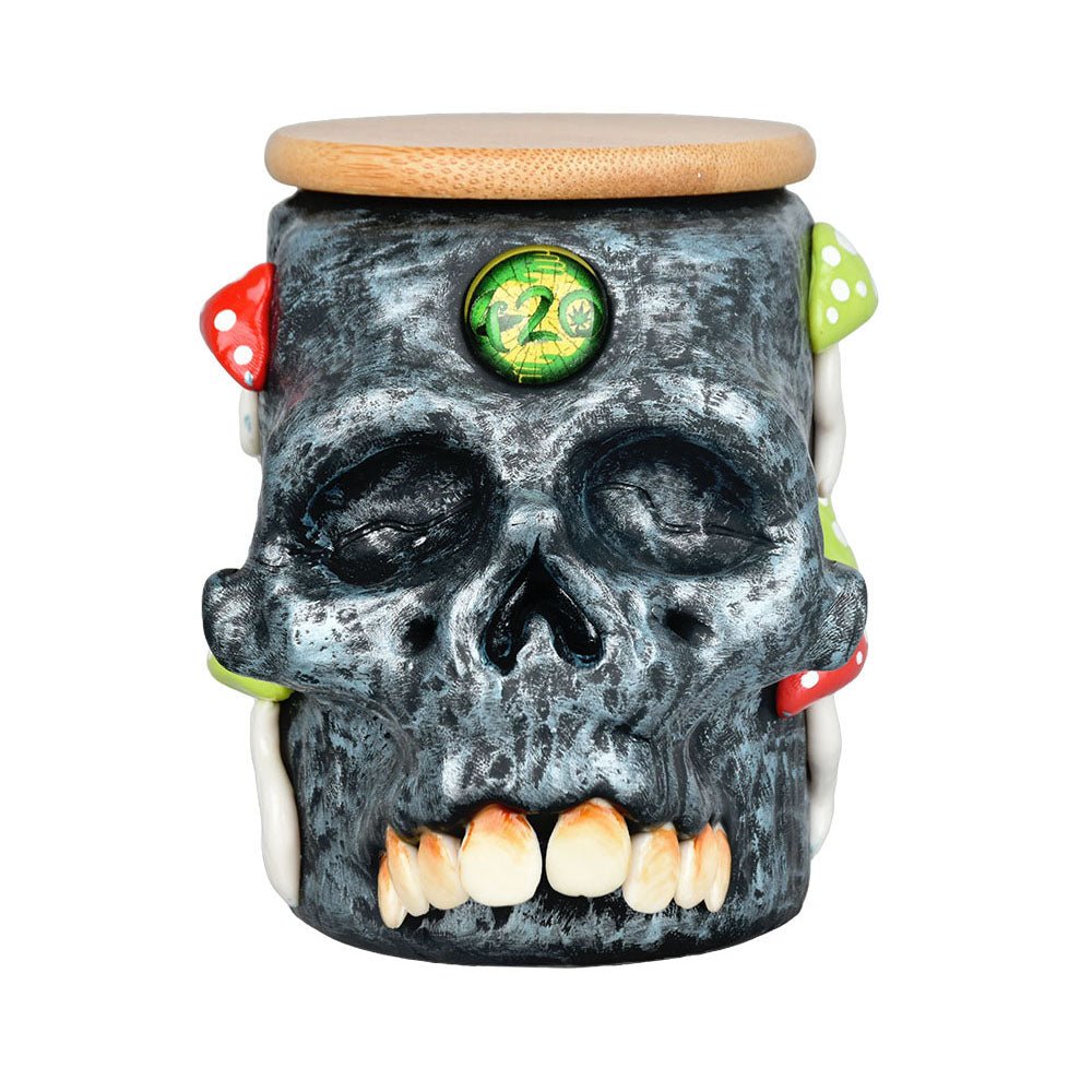 Introducing the Pulsar Third Eye Shroom Skull Glass Jar - a stunning and functional storage solution for your valuables. Standing at a height of 4.25 inches, this glass stash jar is not only a secure storage option but also a visually captivating piece of art. Â