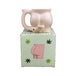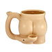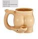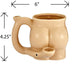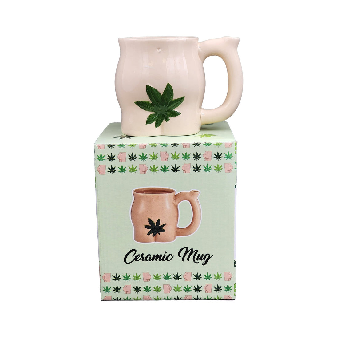 This mug is made of ceramic. It features a realistic-looking butt design on one side and a green leaf design on the other.