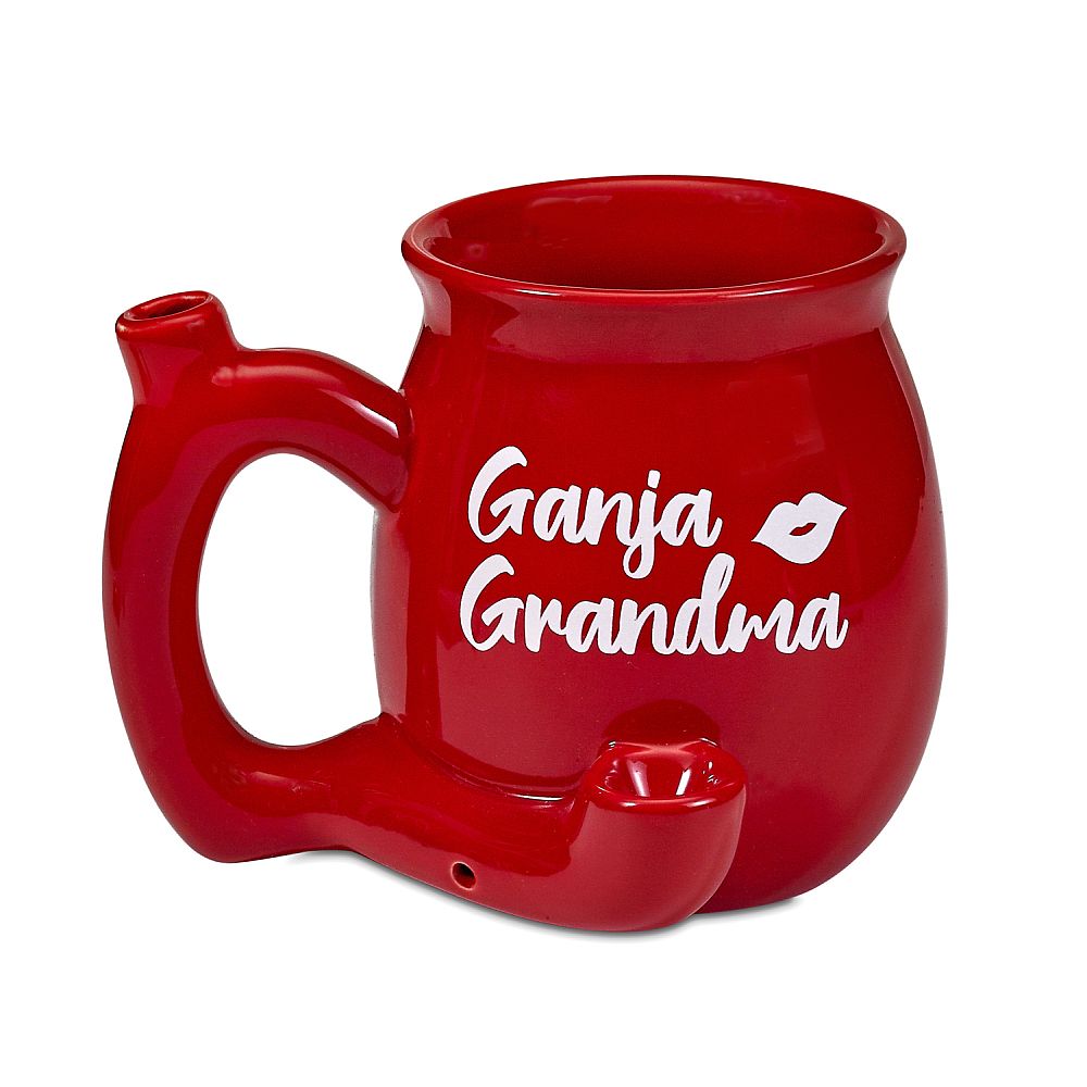 Our new Ganja Grandma mug is made of ceramic. It has a shiny red finish with a matching red inside. On the front are the words 'Ganja Grandma' in white with a white lip graphic.