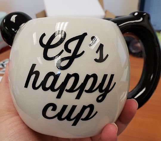 This trendy mug is made from ceramic. It features a panda design in a trendy black and white color scheme. The Panda has fun graphic eyes and huge big ears.