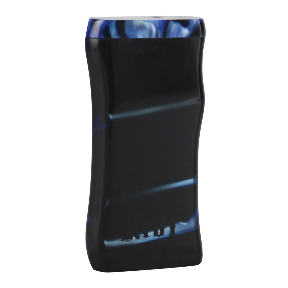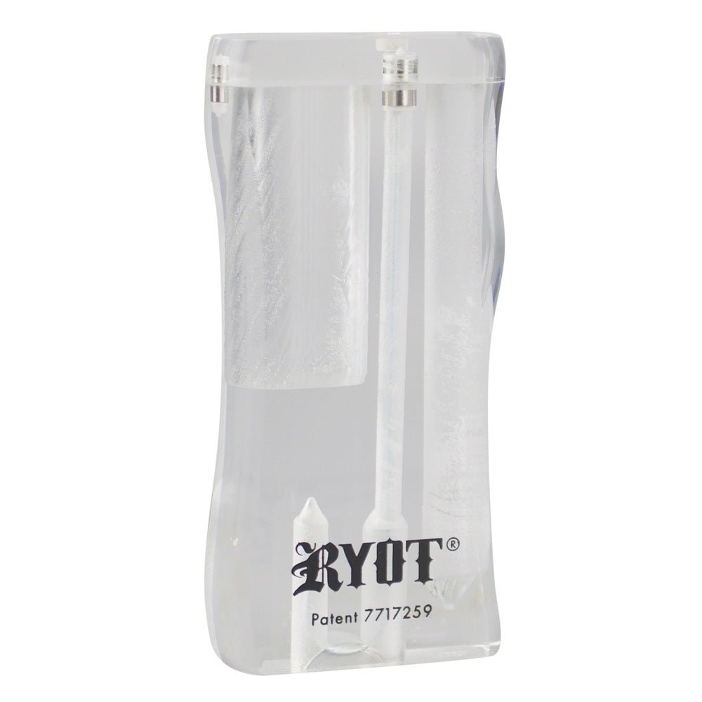 The RYOT Acrylic Magnetic Taster Dugout measures 4.25x2.5 inches (10.8 x 6.35 cm) and features a patented design with a unique pistol grip and magnetized lid. The taster box includes a magnetic poker tool that stores neatly on the underside. Includes a 3 inch (7.62 cm) taster bat. A great on-the-go solution for storage and smoking.