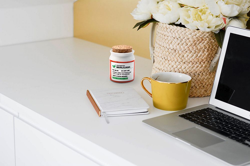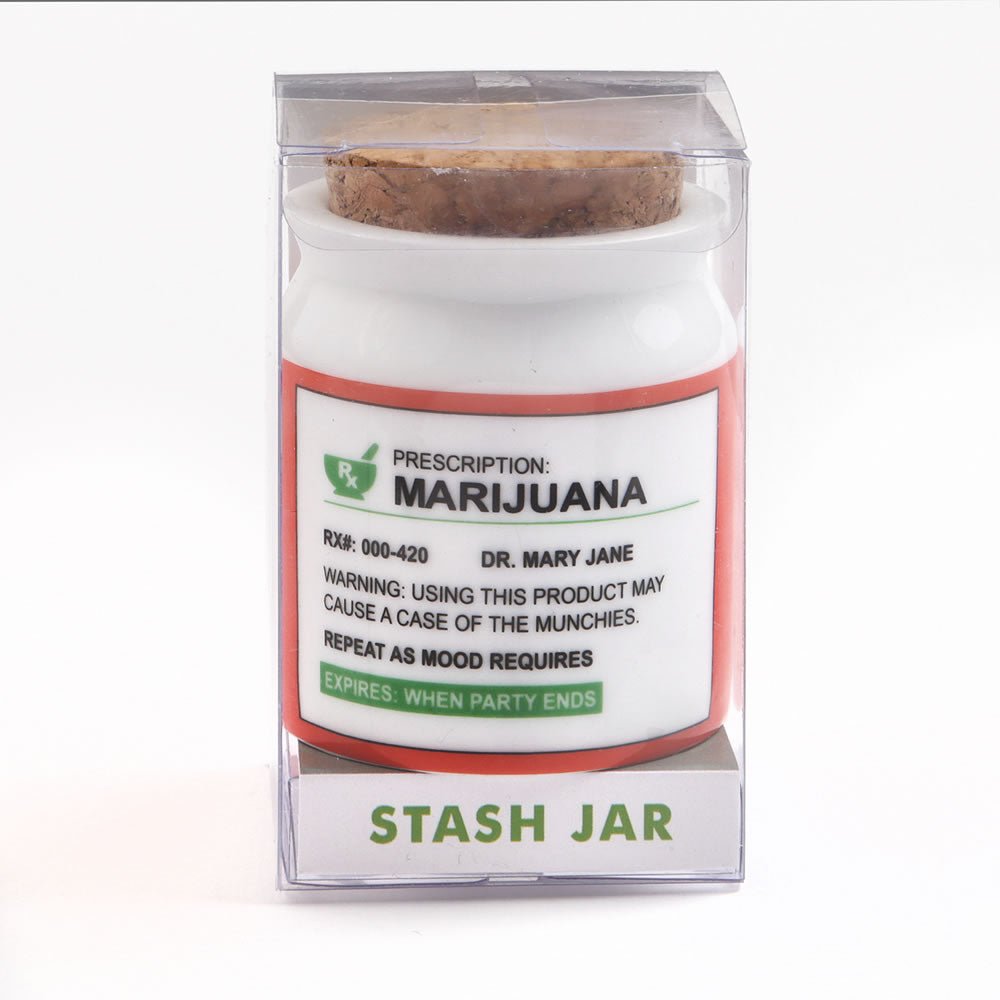 Hot from our latest finds! This small stash jar is made from ceramic and has a cork top. It features a whimsical phony prescription label on the front in white, orange and green colors.