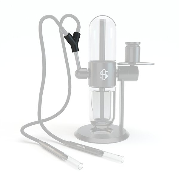 Sharing with a friend? Get this Stundenglass Hose Splitter along with another hose to use two at one time! This hose splitter pushes onto the existing mouthpiece stem in place of the original adapter, for two hoses to magnetically attach to you Stundenglass.