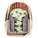 The ThreadHeads Himalayan Hemp Green Leaf Print Backpack features colorful geometric stripes and a green hemp leaf pattern. Produced in Nepal, each pack has adjustable shoulder straps, two elastic side pockets, and two larger zippered main compartments.