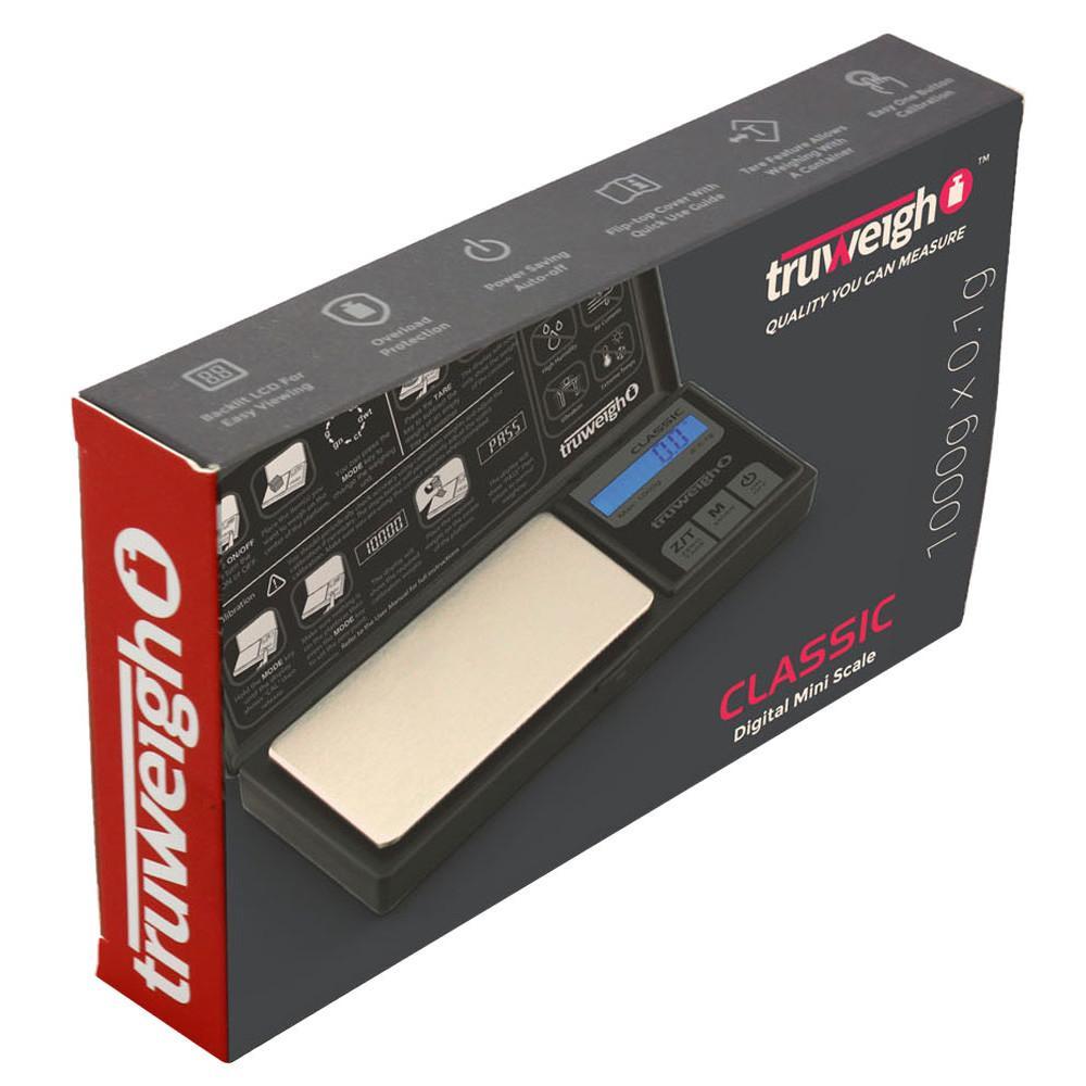 The Truweigh Classic Digital Mini Scale is your basic mini scale with a 1000x0.1 gram weighing capacity. Pop in the included AAA batteries, turn it on and it is ready to go.