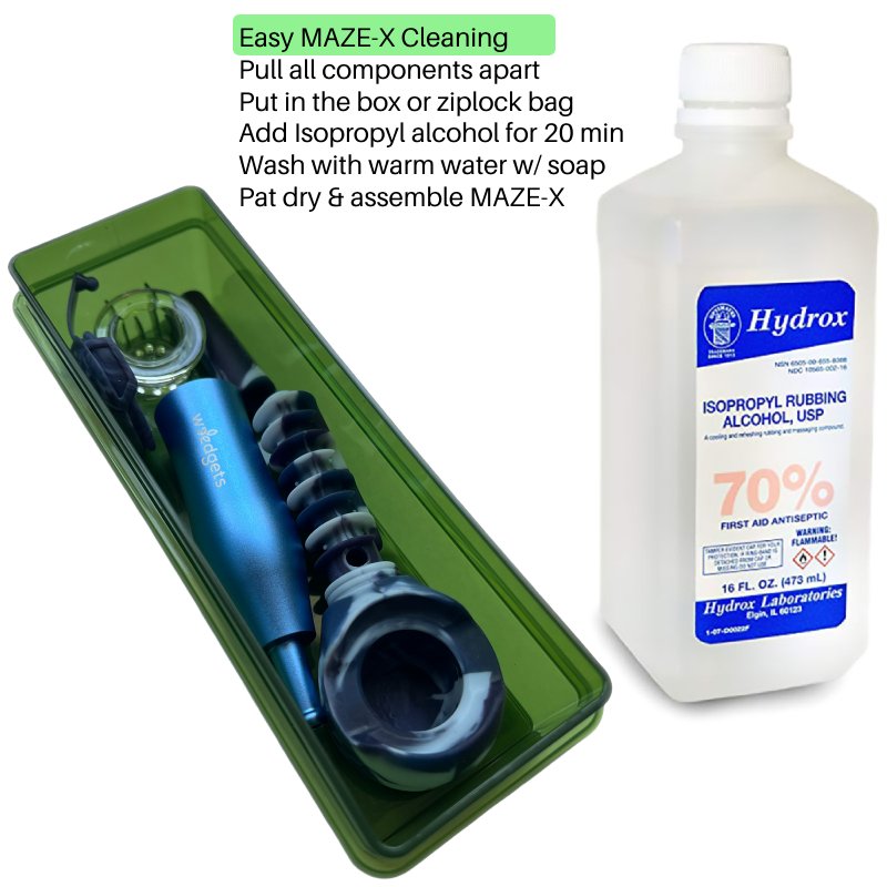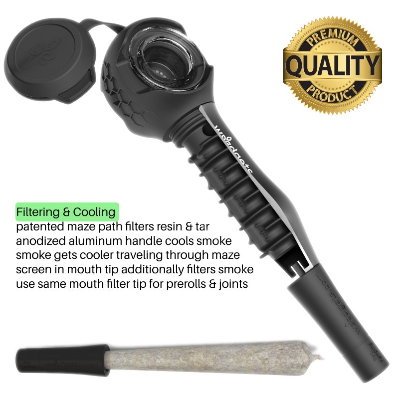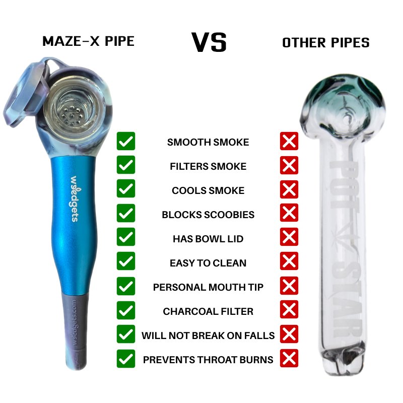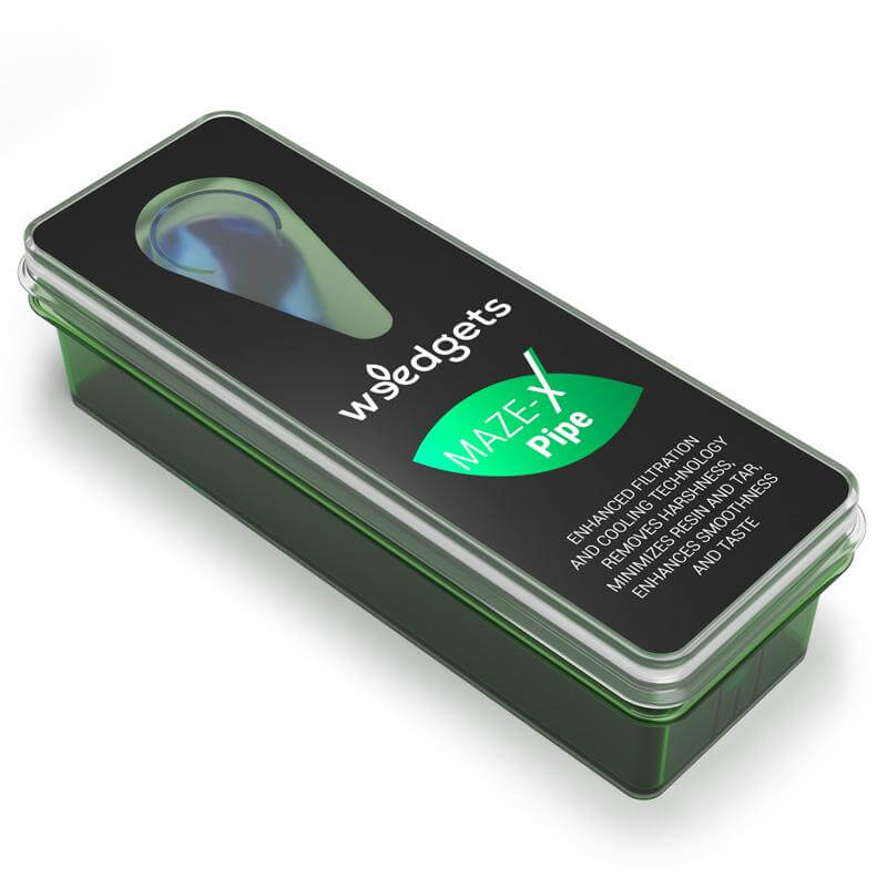 Introducing the all new Weedgets MAZE-X Pipe with unprecedented smoke smoothness. This is how every pipe should be; lots less coughing and more protection for your lungs. This incredible MAZE-X Pipe has a patented cough-less technology inside, drastically cooling smoke and removing hot resin and tar, so it does not burn your tongue or throat.